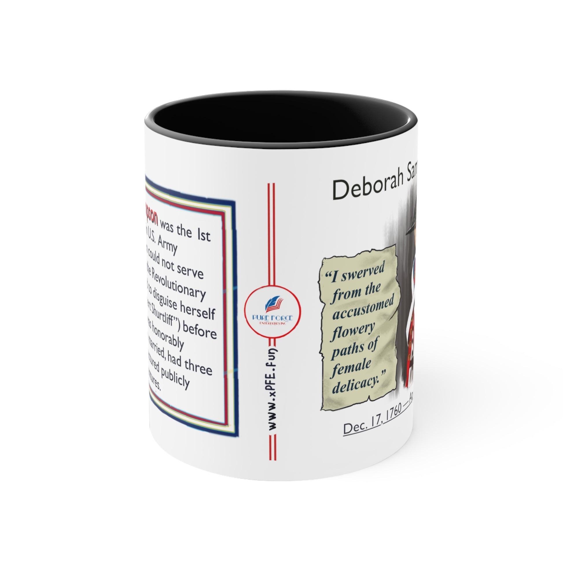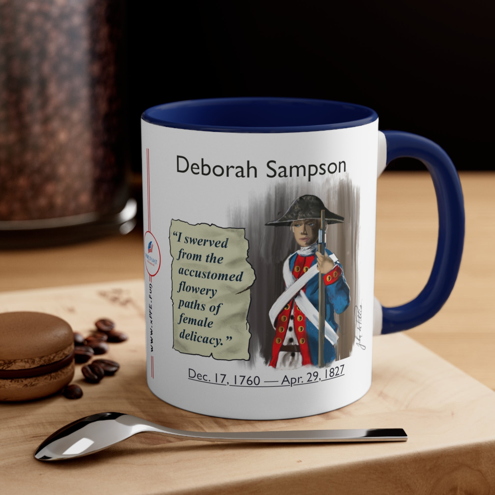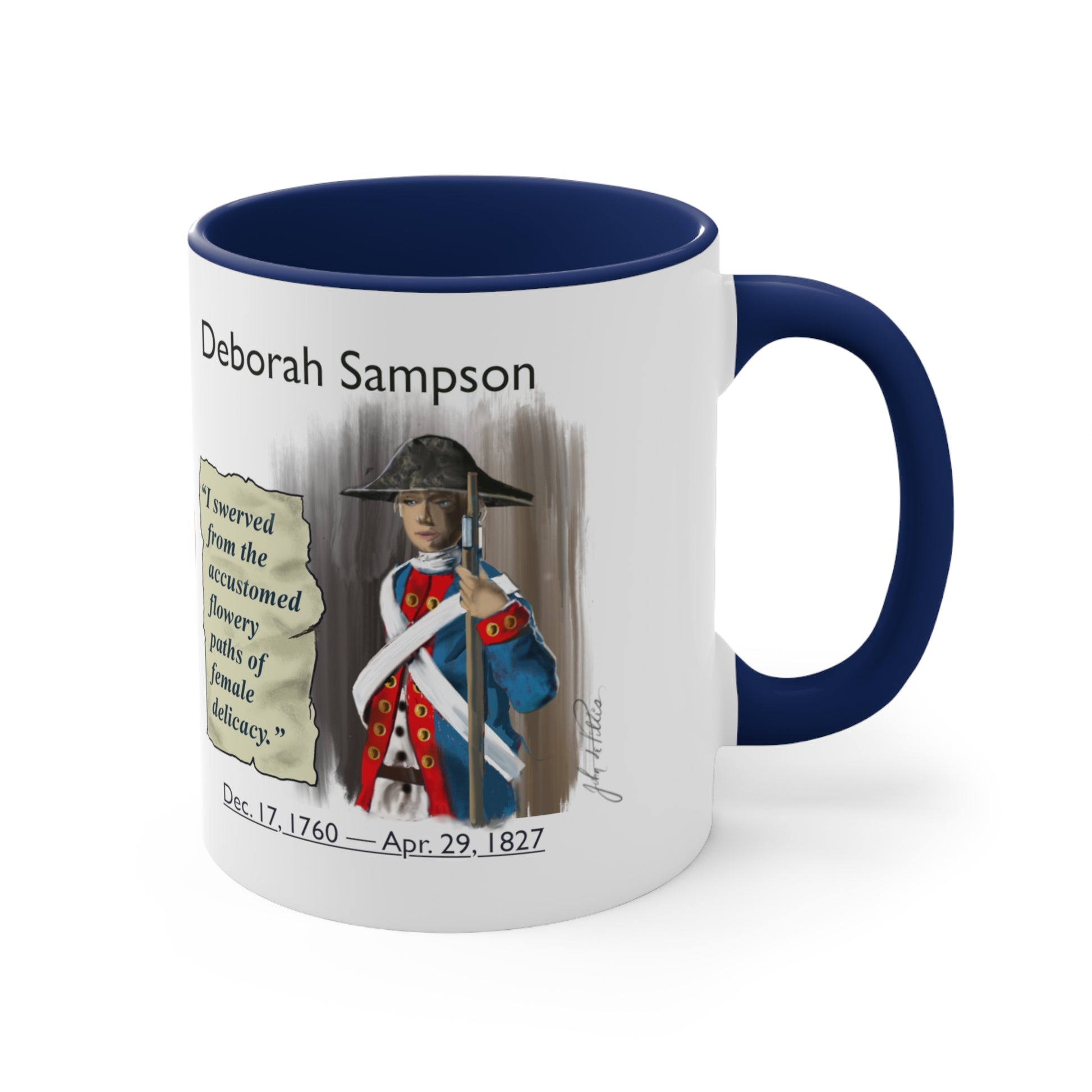 This ceramic 11-ounce mug carries an image of Deborah Sampson on the front and historic notes on the drinkware back. This CHARACTER-themed mug is appropriate as a gift to mug collectors, friends, relatives, or anyone interested in history.