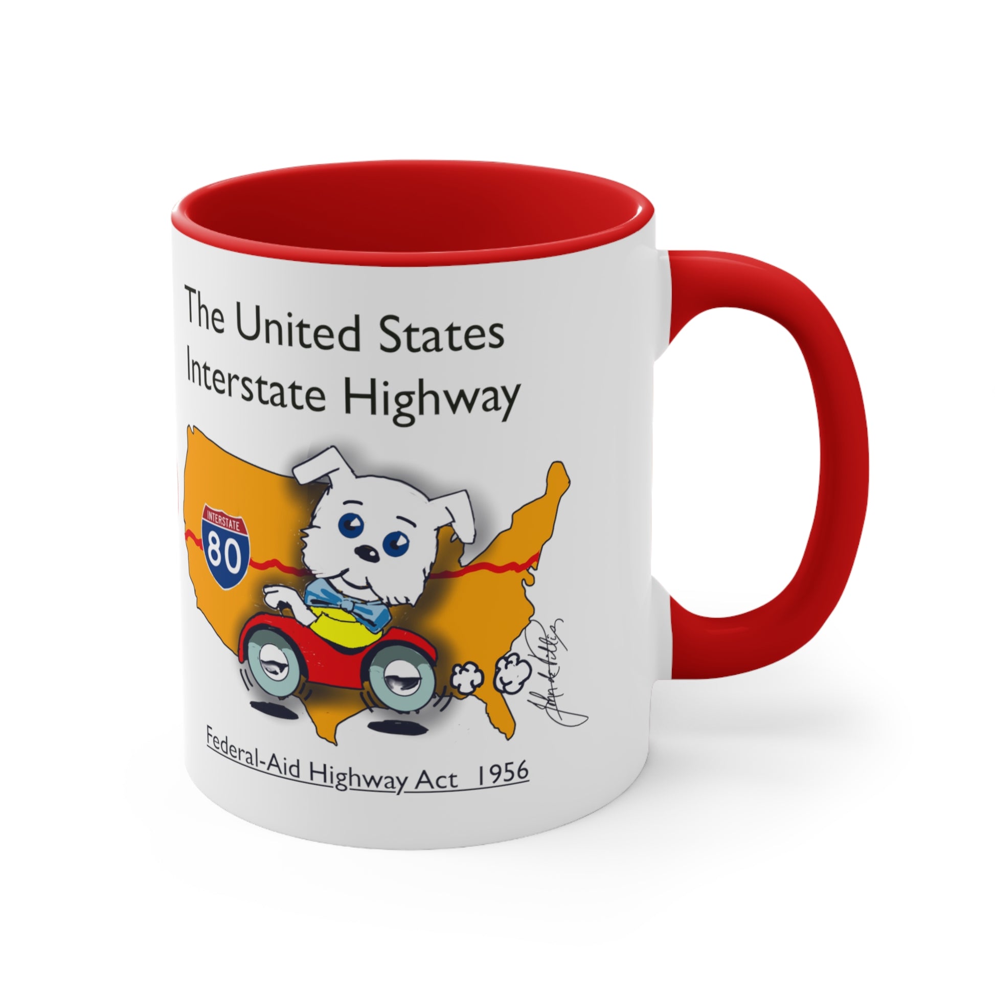 This ceramic 11-ounce mug has an original drawing honoring the historic USA Highway Roads on the front and historic notes on the drinkware back. This mug is appropriate as a gift, but can be given to anybody you think is a history buff. It also has an adorable dog on the mug since we love it when dogs gaze out the window when driving on Route 66 or a Freeway or Highway.