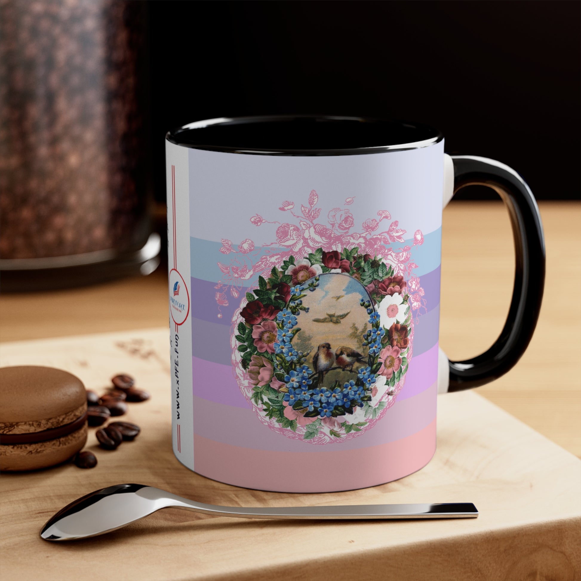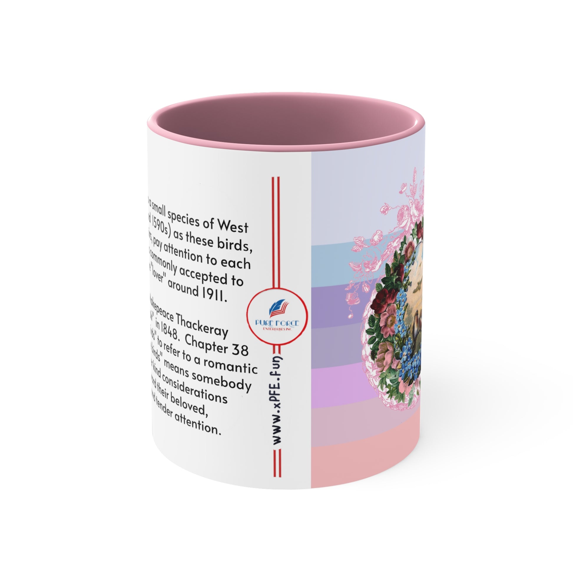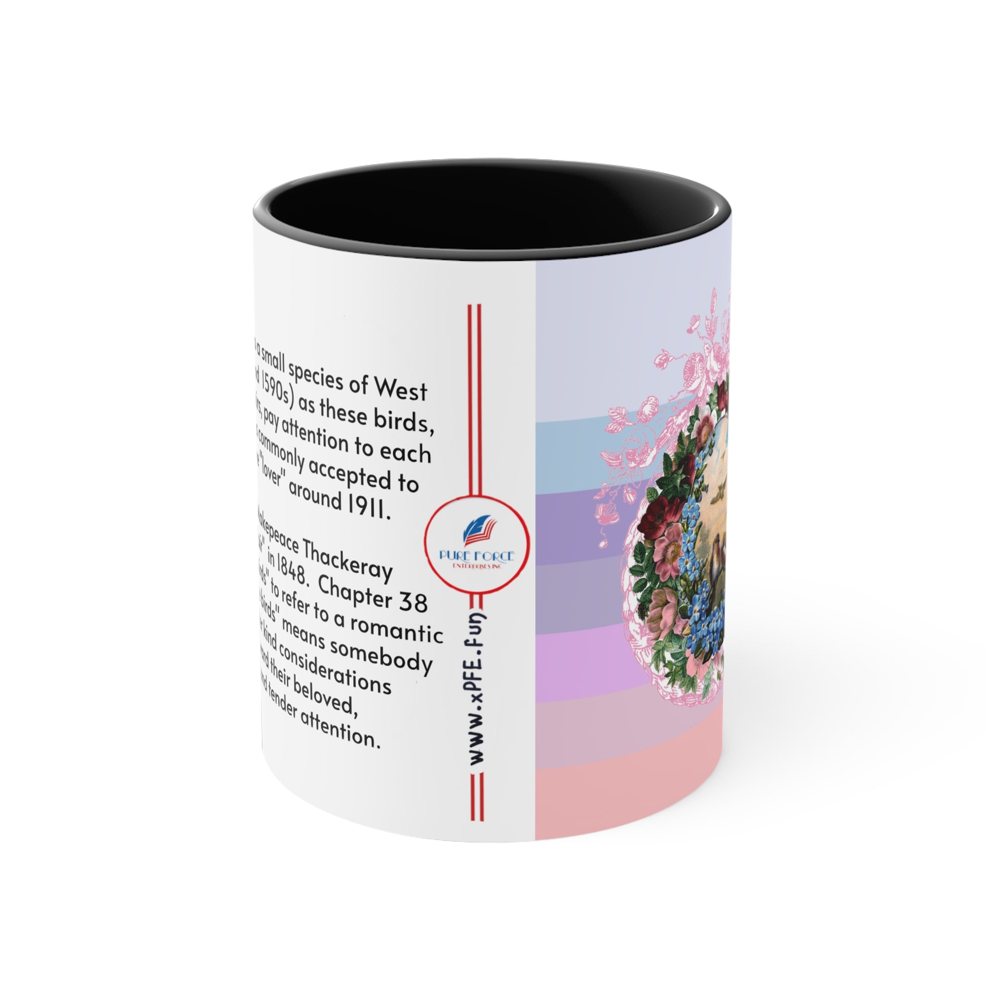 This ceramic 11-ounce mug has the Romantic Lovebirds Themed design on the front and fun facts on the drinkware back. This themed mug is appropriate as a Christmas gift, but can be given to anybody who values classic romance and lovebirds. There are a few accent colors on the handle and inside of the cup to provide a bit of style. Perfect for "Just because", wedding, anniversary, birthday, employee appreciation, graduation, holidays, father's day, mother's day or just showing appreciation for your pet! Or just acknowleging that you are thinking of them as a "just because" gift. This ia a fantastic ice breaker to make new friends or start a conversation with co-workers. You will find ways to spark family and friends into lively discussions, as a gift idea, or add to your own mug or construction collection.